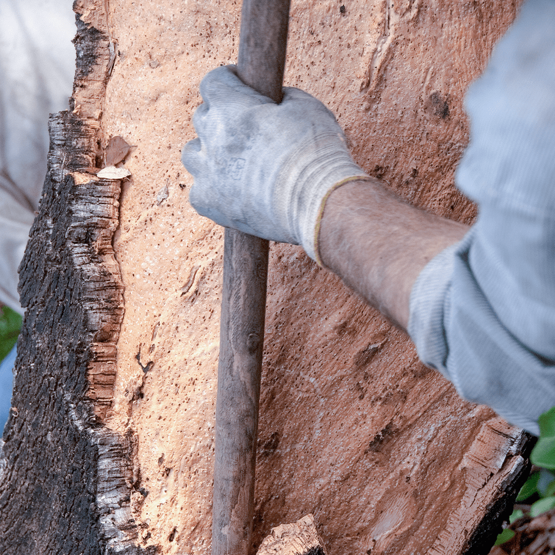 Our cork is sustainably harvested in the Alentejo area of Portugal by skilled experts. Most of the raw material is used to make cork stoppers for wine, before the waste trimmings are reprocessed into sheets. We smoke one layer in a natural process to give it the darker colour. At our Portuguese producer, we combine two layers of sheets, cut into our unique shapes for our final product.