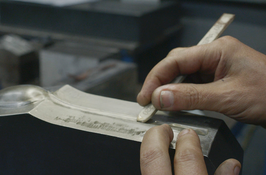 The process first starts with steel ingots sourced from within the EU. The ingots are pressed and roughly cut by machinery from a handcrafted mould. Each piece is then carefully shaped and polished by the makers. 100% of metal trimmings in the production process are recycled and reused.